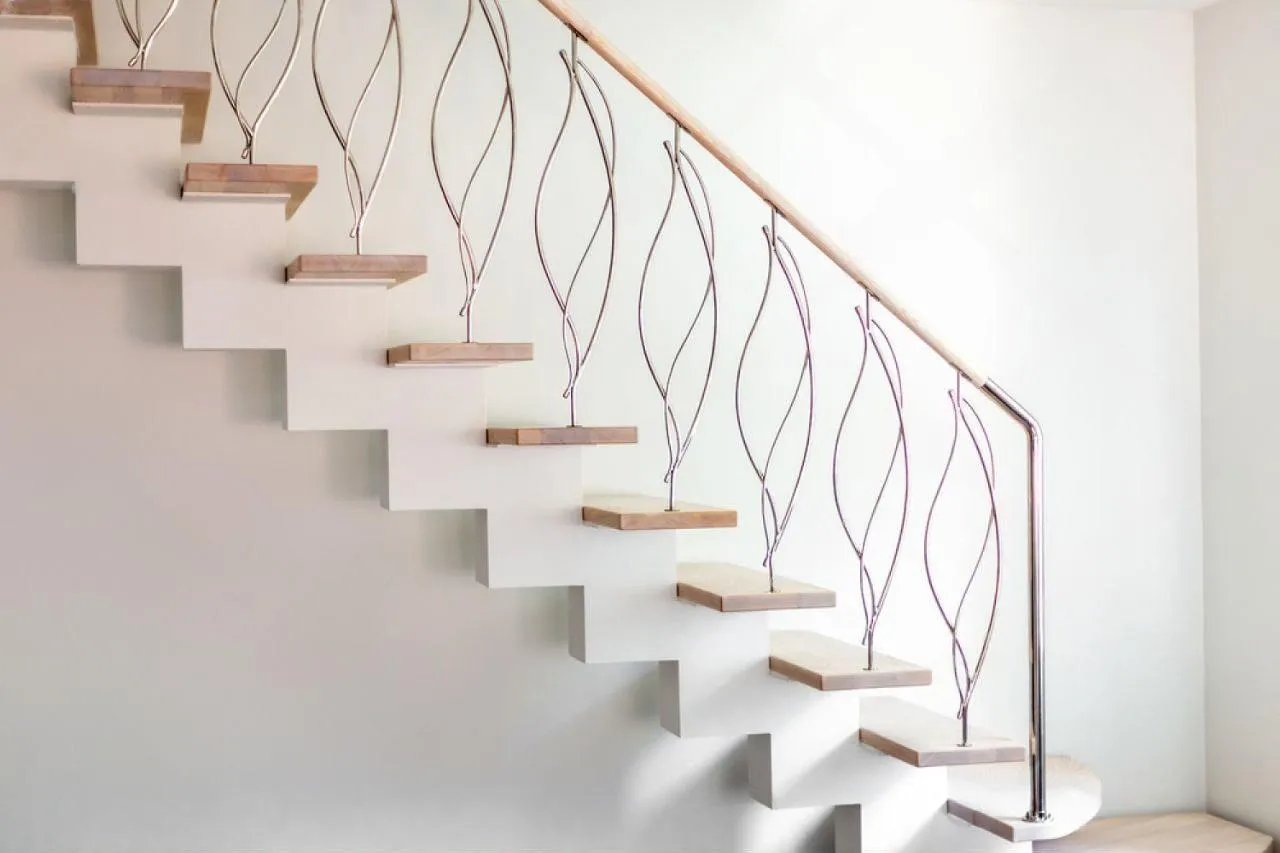 Основа из бетона обеспечивает абсолютную монолитность и бесшумность — эта лестница будет служить десятилетиями, не издав ни единого скрипа. Прочные кованые перила не только красивы, но и гарантируют надежную опору при каждом шаге. Ступени из массива бука, известного своей твердостью и износостойкостью, обеспечивают безопасное и комфортное передвижение для всей семьи, а их ширина позволяет ставить ногу уверенно.